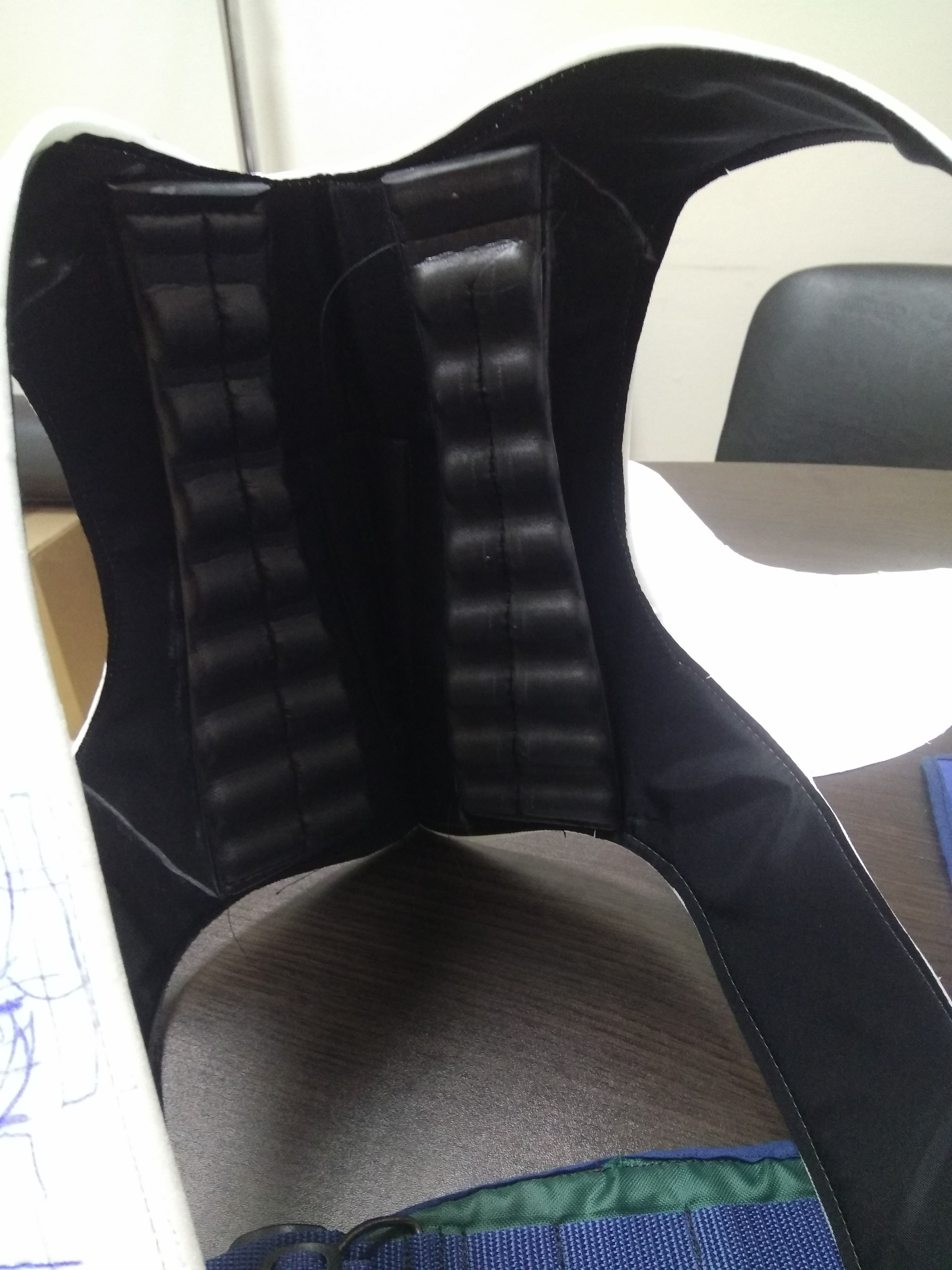 Разгрузка. Разгрузка выполнена из прочной непромокаемой ткани Кордура 500, имеющей повышенную устойчивость к истиранию и на разрыв. Для поддержки спины применяются специальные композитные пружины, не подверженные коррозии и без эффекта памяти. Благодаря им спина постоянно стремится занять вертикальное положение. Так же они стабилизируют положение тела в состоянии устойчивого равновесия. Для обеспечения вентиляции спины и уменьшения потения применяются вспененные рифленые вставки по обе стороны от позвоночника. Они точечно прилегают к спине, обеспечивания циркуляцию воздуха. Мягкий пористый материал защищает спину и обеспечивает равномерное примыкание, повторяя рельеф спины.