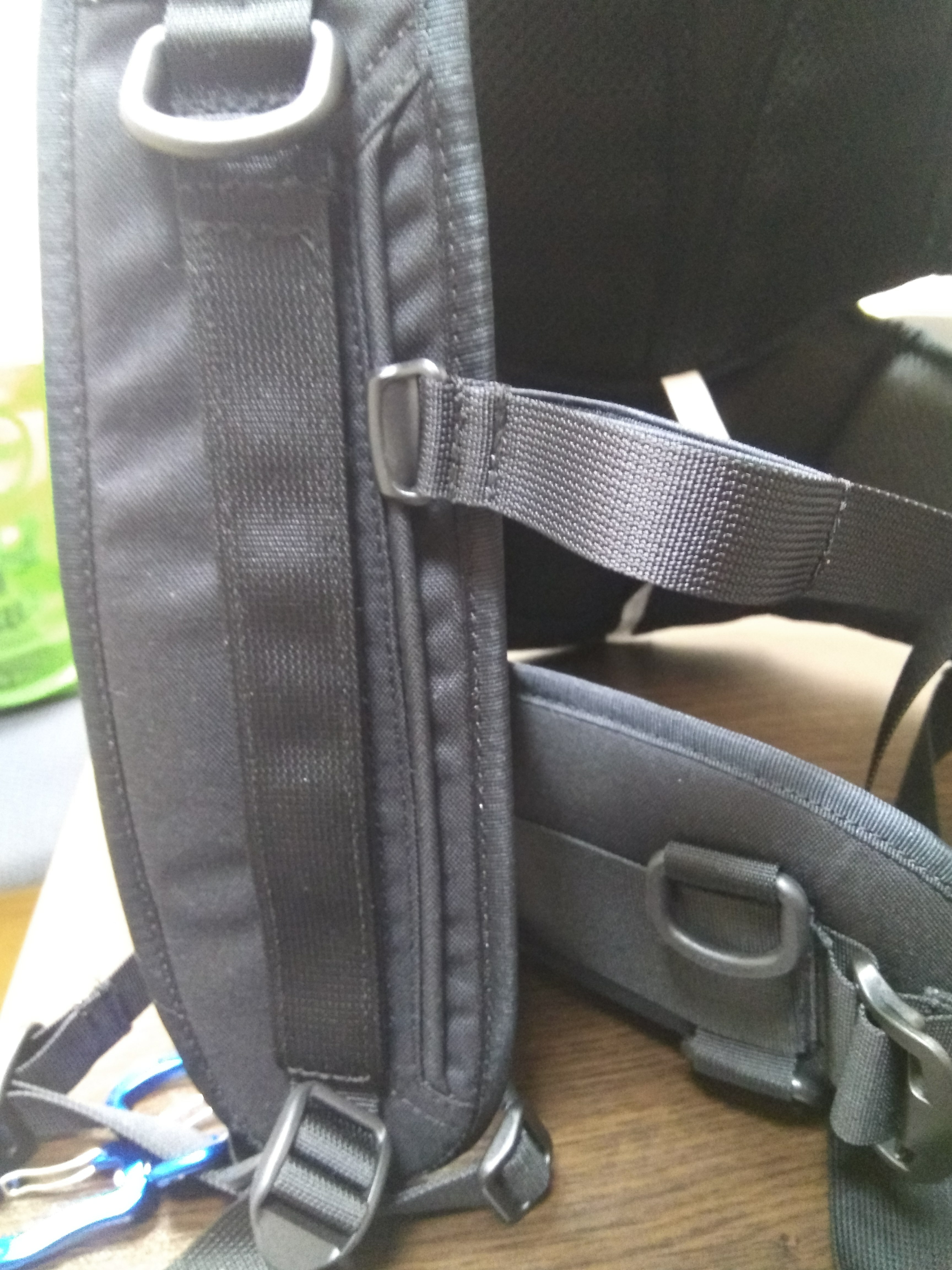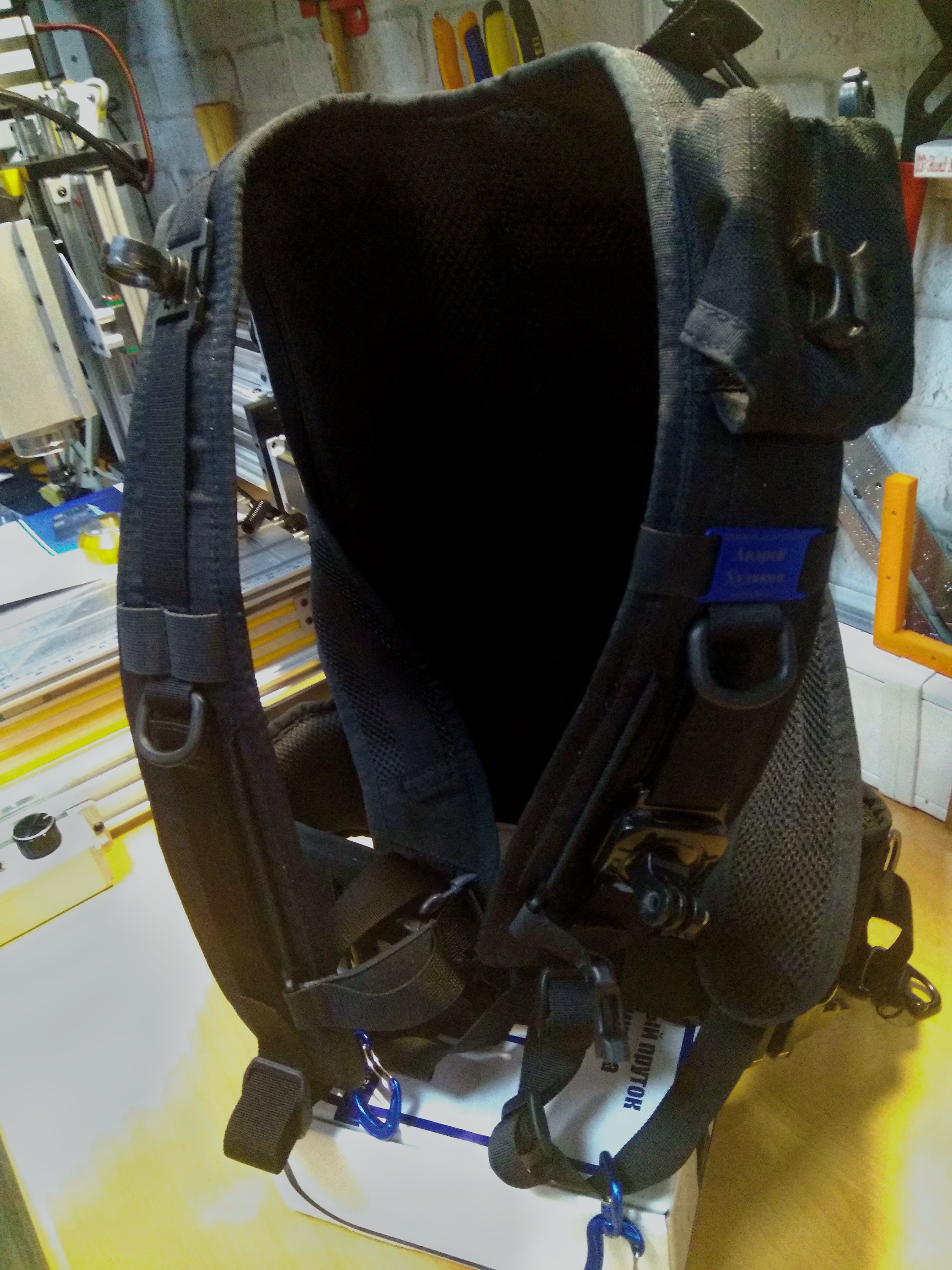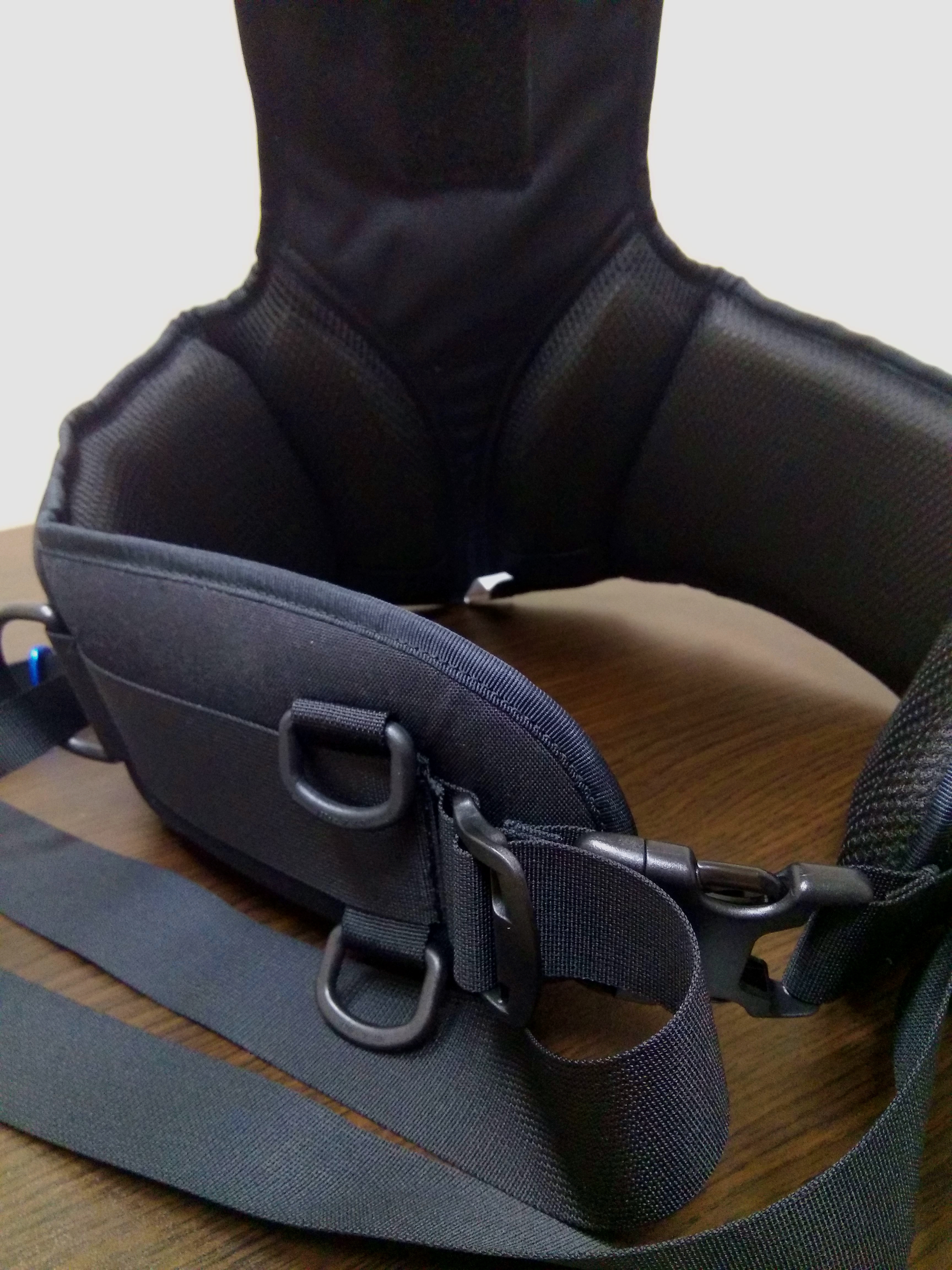Лямки спроектированы так, что кроме основного функционала - крепления рекордера, позволяют монтировать дополнительное оборудование и приспособления. В штатную комплектацию входит карман для рации или смартфона, расположенный на левом плече. Такое положение не мешает работе и оперативно в доступе. На правой лямке расположен крепеж под фонарь. Благодаря свободному скольжению по стропе фонарь может легко перемещаться, позволяя светить как вперед, так и вниз, обеспечивая освещение в зоне панели управления рекордера. Ниже расположены прорезиненные отсеки для мелочевку типа ручки, ножниц или того, что вам может понадобиться в оперативном доступе.